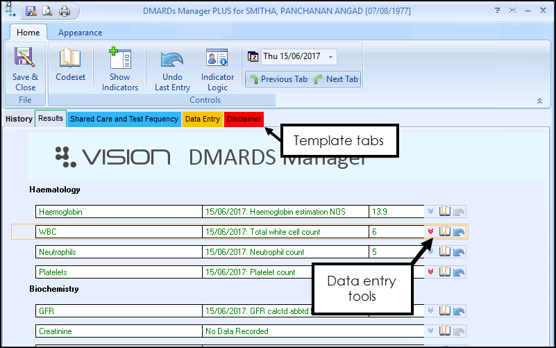 For information on recording data on the DMARDs Manager PLUS screen, see Managing your Patients using the DMARDs Manager PLUS Template.