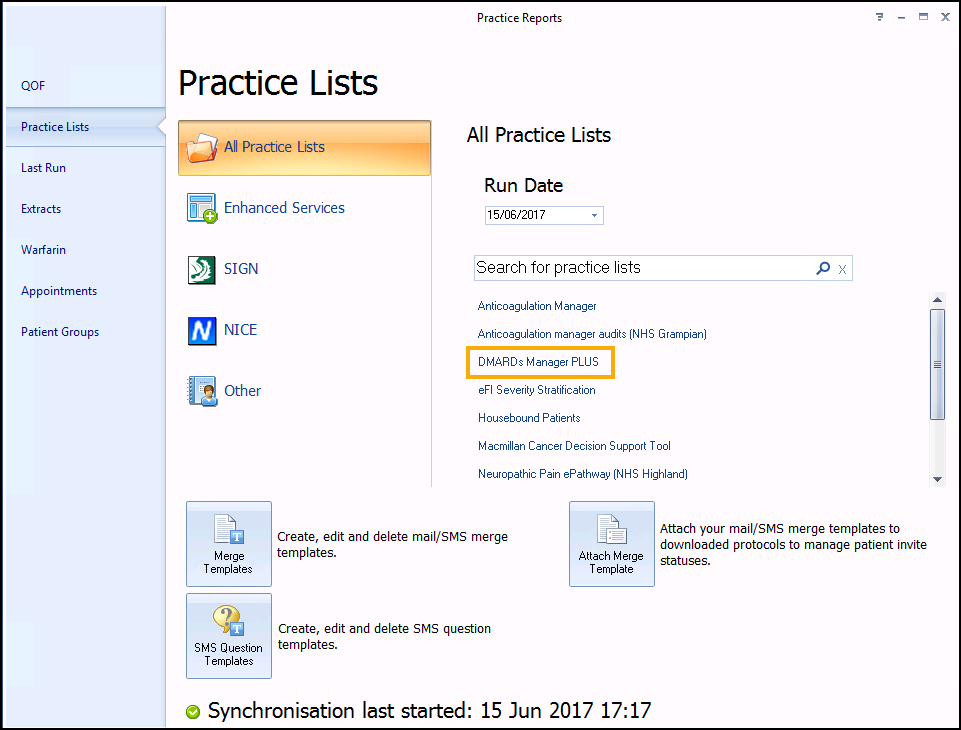The DMARDs Manager PLUS suite of reports enables you to carefully monitor patients on DMARD medication and highlights patients displaying untoward drug effects. The reports provide the information required to take appropriate action if the patient requires a review. To run the reports: