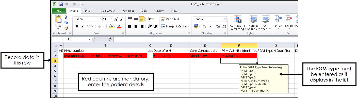 - Open the FGM_ Excel claim form from the FGM Recording and Reporting (2015/16) Clinical Template.