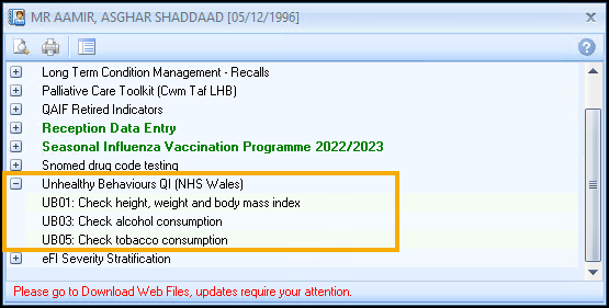 .Note - By default QOF/QAIF alerts display when you select a patient in Consultation Manager. To combine both QOF/QAIF and non-QOF alerts, see Options - Indicators. - The Alert screen displays the Unhealthy Behaviours QI (NHS Wales) sub-category headings expanded to show relevant data:
