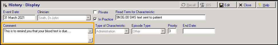 Within Vision+ you can send a free-text SMS message to an individual patient.