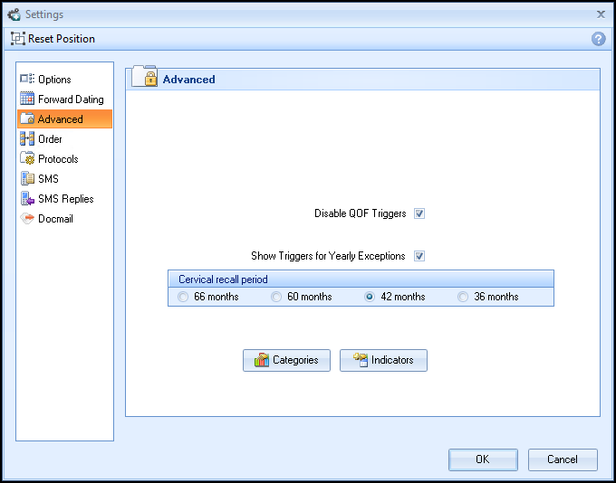 - Cervical recall period - This button determines how often cervical smears are required. This setting is set to every 5 years by default, but a small number of health boards require this to be done every three years. Please contact your Health Board if you are unsure.