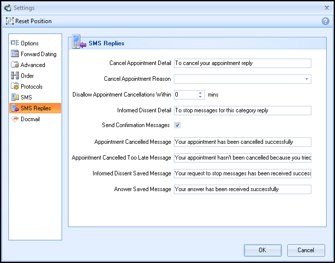 - Send Confirmation Messages - Select to enable a confirmation message to be sent for all responses received for appointment cancellations, informed dissent and questionnaires.