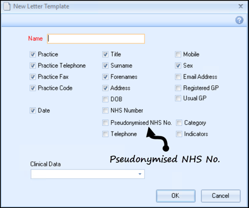 At the request of practices who have patient’s participating in studies and trials, a new pseudonymised NHS number merge field is available. This inserts a forty-two-digit encrypted NHS number into any correspondence sent to or regarding the patient.