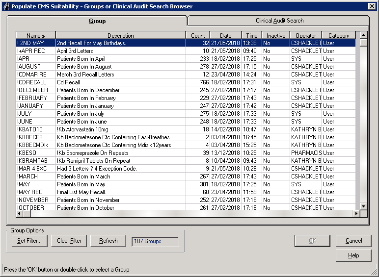The Populate CMS Suitability function allows you to mark patients as suitable or unsuitable within a specific patient group. You might like to review your chronic disease registers for patients potentially suitable for CMS (Serial Prescribing). You can use the Clinical Audit audit groups to identify chronic disease patients and merge the groups together to create a definitive list of all chronic patients. You might also like to add a reminder to the flagged patients. The best way to do this would be to run the CMS Suitability report (see Report Output) and save the results to a group so that you can bulk add reminders from patient groups.