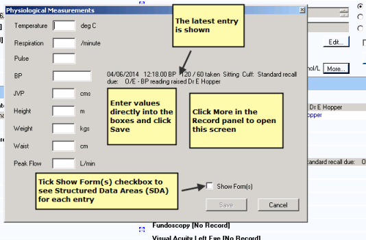 - More - Selecting More opens the Physiological Measurements screen in which the most common physiological measurements can be quickly entered:
