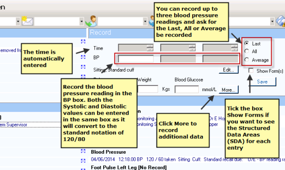 - BP - This will allow the entry of up to three blood pressure readings and the filing of just the latest, all the readings, or an average. If only one of the three readings is to be filed, it is easy to remove the other two as they are recorded in the different boxes