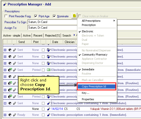 You can copy the prescription ID for electronically prescribed prescriptions from the All tab to the clipboard by right clicking on the item in the Prescription Manager screen. This is useful for tracking prescription messages.