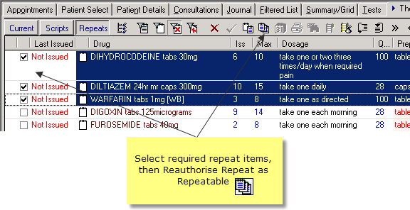 Reauthorise Repeat as Repeatable is an option on the repeat therapy tab which allows you to bulk select existing repeat masters and change them into items for Repeat Dispensing (also known as Batch and Repeatable). The function is similar to bulk reauthorisation but processes each selected repeat sequentially so you have an opportunity to review each repeat before it is changed into a repeat dispensing item. Each repeat has to be processed to completion before the next one is considered and enters a tick into the Batch check box. See also Repeat Dispensing in the Consultation Manager web help for further information on repeat dispensing.