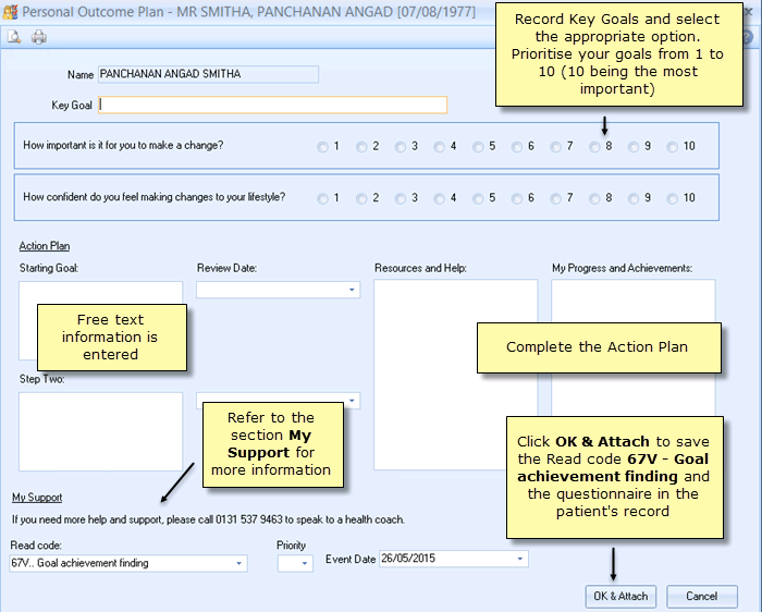 - Click OK & Attach to save the Read code 67V - Goal achievement finding in the patient's journal as a history entry. The questionnaire is also saved as an attachment in the patient's record. Note - Only Read code 67V - Goal achievement finding is saved in the patient's record no other details including review dates are recorded. To view this information you need to open the questionnaire as an attachment, for more information on attachments - See Viewing Attachments.