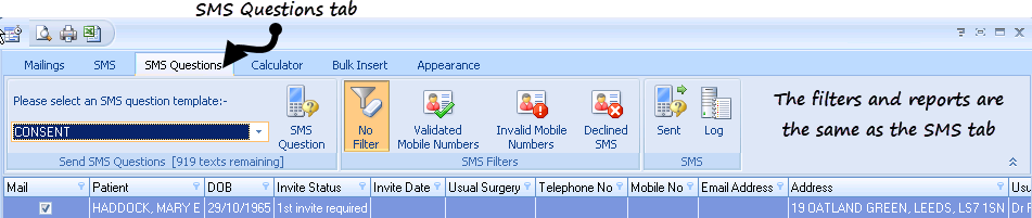 tab enables you to send a patient an SMS questionnaire which the patient can respond to via SMS. The SMS Question tab works the same as if sending a group of patients a questionnaire - See Questionnaires via SMS.