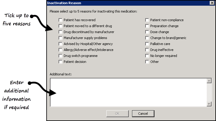 - Tick up to five reasons for inactivation, in the correct order, most appropriate first.Note - It is important you select the inactivation reasons in the order of relevance, they are listed in the patient's record in selected order and the initial selection is coded for GP2GP transmission purposes. Any subsequent reasons selected are transmitted as text for GP2GP. If you select them in the wrong order, simply deselect them and then select in the correct order.