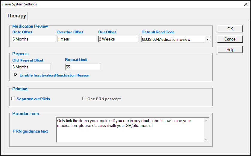 The Therapy screen displays. Practice wide medication settings are added and maintained here including the practice wide Repeat Limit: