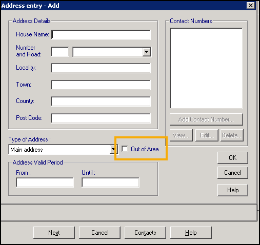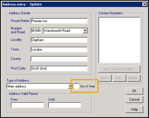 Update the address details if required and tick Out of Area.