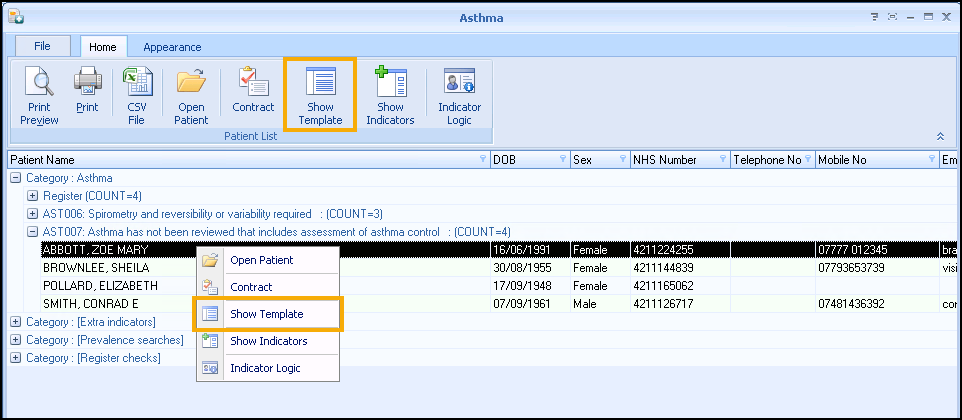 You can also open a template from Practice Reports - Patient Lists. Right click on a patient's name and select Show Template
