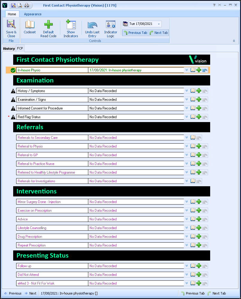 Templates can also be distributed between GP practices, for example your primary care network, Integrated Care Board (ICB) or Health Board (HB), for example, all Vision 3 practices in a Health Board could use the same physiotherapy template as in the example below: