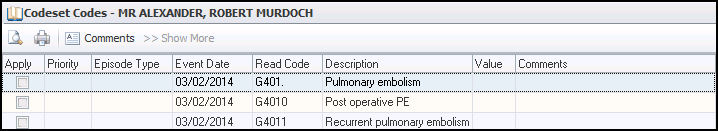 - Double click on the line of the relevant Indication or select Codeset