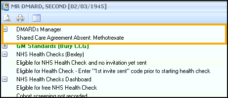 .Note – By default QOF/QAIF alerts display when you select a patient in Consultation Manager. To combine both QOF/QAIF and non-QOF alerts, see Options - Indicators. - The Alert screen displays the DMARDs Manager PLUS sub-category headings and is expanded to show relevant data.