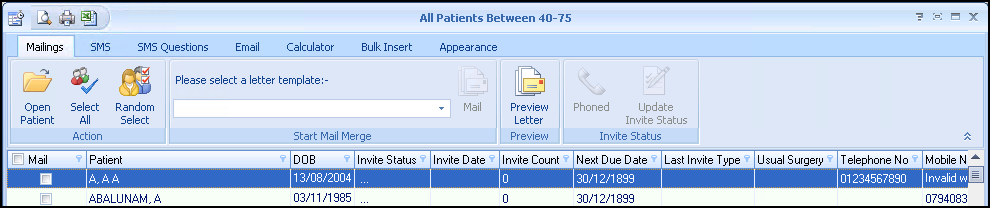 Highlight the group and select Merge Patient Group to display the Mailings screen: