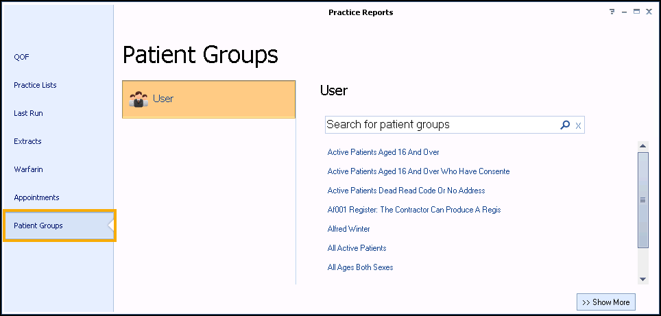 - From Vision+ - Practice Reports, select Patient Groups: