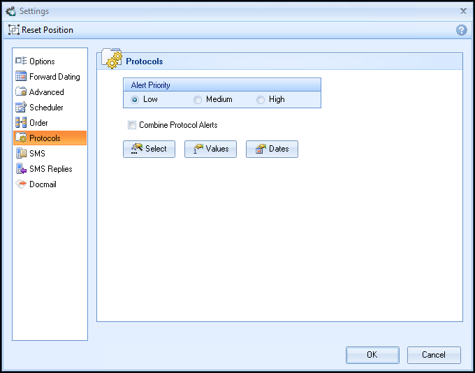 The Protocols Tab allows you to further customise the alert indicators by selecting whether to show high, medium or low priority indicators and whether or not you want to combine them.