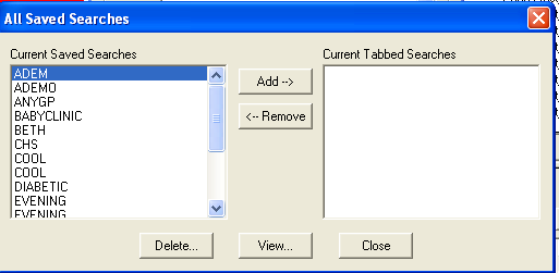 Highlight a saved search under Current Saved Searches and click on Add. This places it into the right-hand Current Tabbed Searches. This search will then be available as a search tab within Consultation Manager Appointments, next to the Free Slot tab. You may not see any newly created tabs until the Appointment tab is refreshed with the next patient.