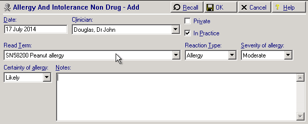 , select the patient required and ensure a consultation is open. - In Read Term - Add enter a keyword and press return, if the Read code returned is not correct, press <F3> to locate the correct Read code: