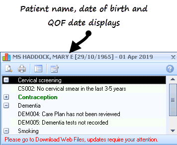 At the top of the Alert Indicator window is the patient's name and QOF date. The date can be set as the Reference date eg QOF year end, today's date or a future date. For more information on how to change the date, refer to Configuration and Settings On-screen help.