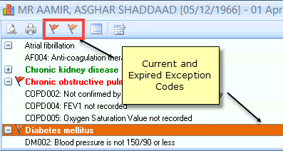 Previously used Exception codes for the selected patient are represented with an Orange flag icon. If you hover the mouse over the exception icon it displays the Exception Read code along with the date of the previous exception entry.