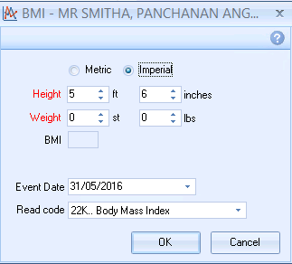 The BMI Data Entry screen is used to quickly input the height and weight values. Vision+ will then calculate the BMI for you and record the appropriate Read code into the patient's journal.