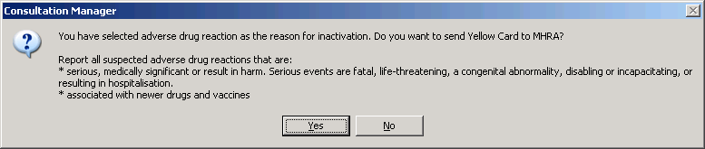 - When prompted "You have selected adverse drug reaction as the reason for inactivation. Do you want to send Yellow Card to MHRA?" Select Yes.
