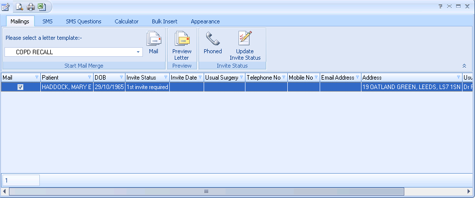 The Mailings screen displays with the patient details ticked.