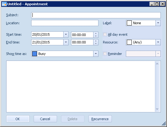 All standard calendar appointment functionality is available including recurrence, highlighting and reminders, and resource allocation.