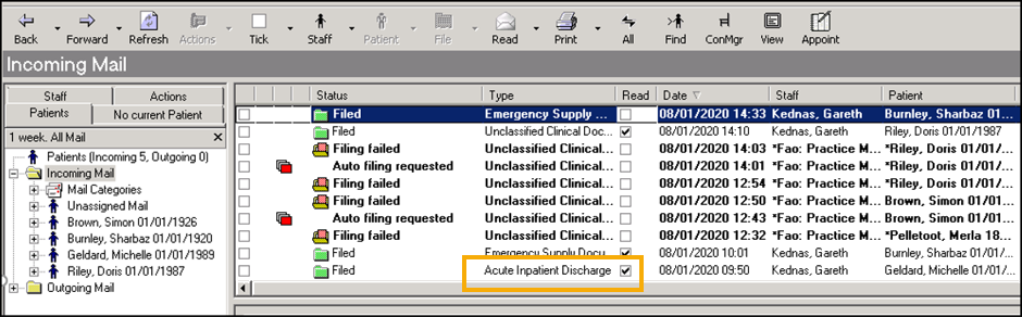 - Filed - Provided the message is assigned to a patient and allocated to a mailbox it automatically files in the patient record. If not, it can be filed, see Filing in the Mail Manager Help Centre for details..