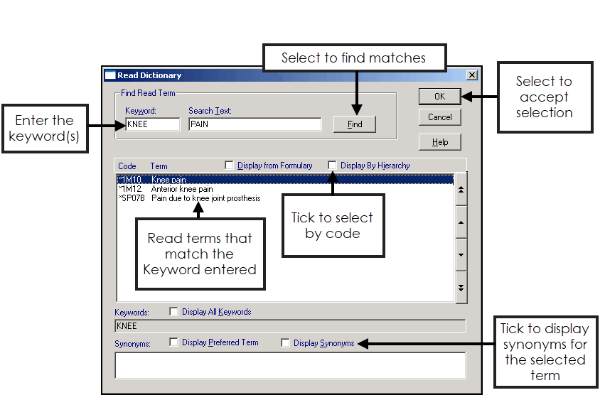 See Keywords for further details.- A Read code - Type # and then the code, for example #H33 for Asthma, code entry is case sensitive and press enter: