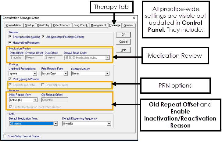 Practice-wide therapy settings are visible but disabled in Consultation Manager - Options - Setup - Therapy. To update PRN and practice-wide therapy settings, see Management Tools - Therapy Settings for details.