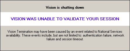 - Token invalidated - The message reads: Vision is shutting down. VISION WAS UNABLE TO VALIDATE YOUR SESSION.
