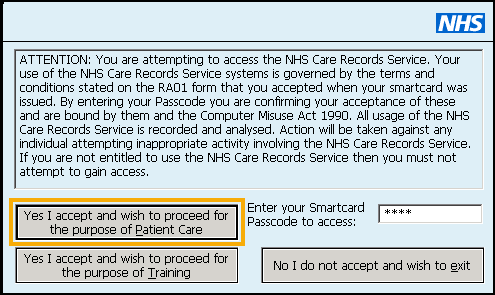 - The GEM Authenticate screen displays, enter your Smartcard passcode and select Yes I accept and wish to proceed for the purposes of patient care.