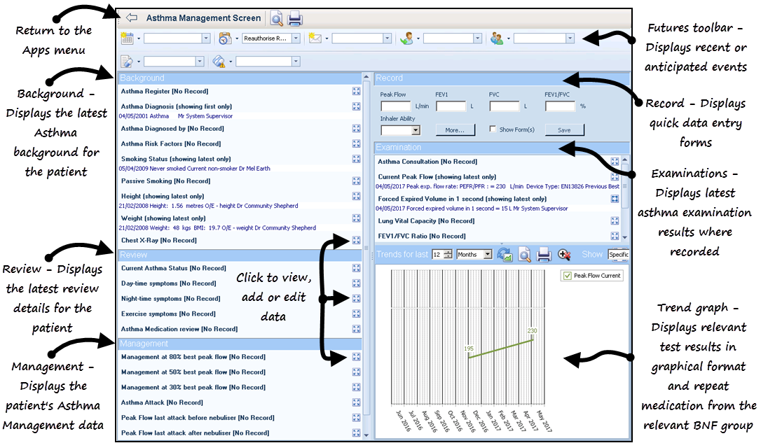 is designed as an interactive screen for the management of patients with asthma. It brings all standard aspects of asthma management together in one place which can be very beneficial especially for Asthma Clinics when used in conjunction with the Appointments worklist. The Asthma Management Screen can be accessed from either: