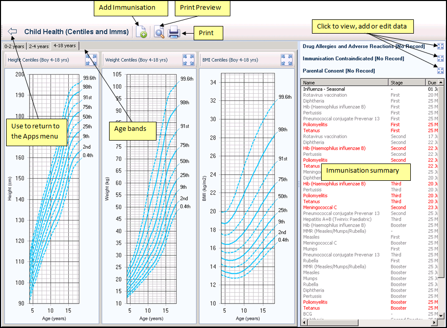 The Childhood Growth Charts display Height, Weight and BMI Centiles grouped in tabs by age band (0-2 years, 2-4 years and 4-18 years), the default is the one representing the selected child's current age.