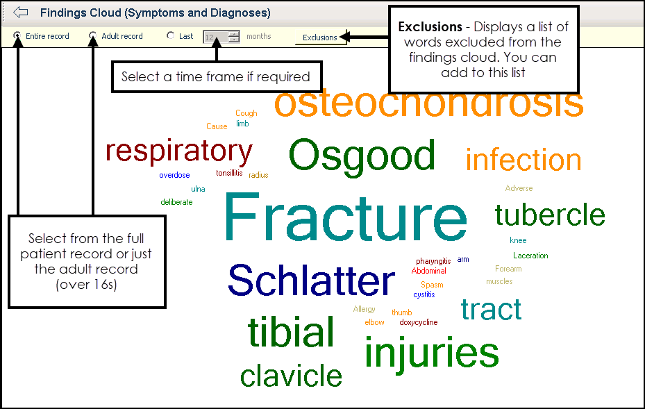 displays a tag cloud based on the frequency of Read terms recorded as symptoms or diagnoses in the patient record. It provides a clear snapshot of the conditions and symptoms the selected patient is presenting with:
