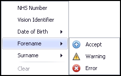 - Warnings - The warnings allow you to specify how the app handles the imported data. For the forename, surname and DOB options you can specify any of the following options where a discrepancy exists, select a Warning level for the field: