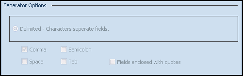 - Delimited - Characters separate fields - If you are importing data from a text file Delimited is enabled. Select the character that separates the values in your imported text file from the following selection: