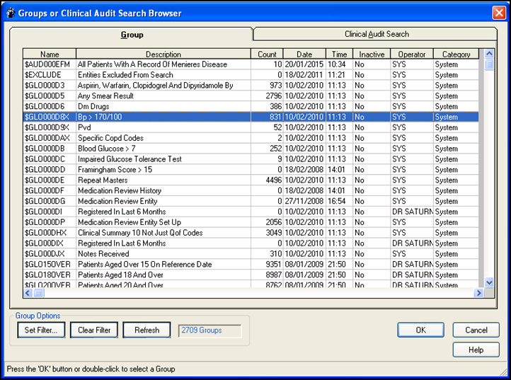 . - The Groups or Clinical Audit Search Browser screen displays: