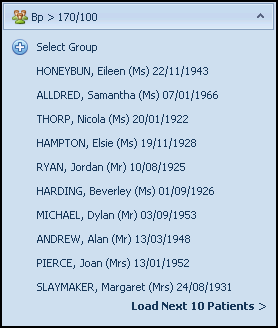 displays at the bottom of the visible patient group list. Simply work through the visible list and then select Load Next 10 Patients >