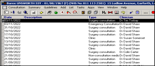 - Either click on the required earlier consultation to highlight it, then select Consultation - Open Existing Consultation to open the consultation (but only if any current consultation is closed). Remember you can always check which consultation is currently open from the information displayed on the Status bar line at the bottom of the screen. Select Close Consultation