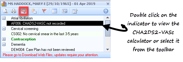 Some QOF indicators require calculators to be used eg patients with Atrial Fibrillation requiring a CHADS2 Vasc score. For those indicators you can access the relevant calculator on the Alert Toolbar or by double clicking.