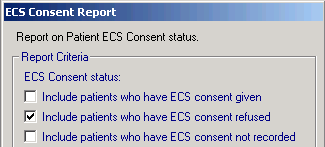 - Include patients who have ECS consent not recorded - Tick this option for those patients that have not had a consent recorded in either the ECS Management Summary screen in Consultation Manager or their Registration screen.