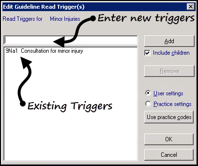 You can add Read term triggers to Guidelines, so that when the triggering Read code is add to a patient record the Guideline is offered, see Triggered display of Guidelines.