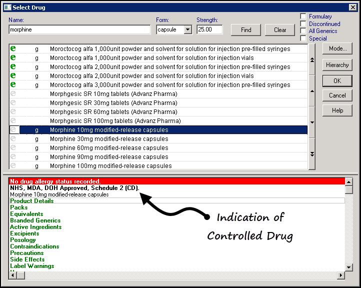 Controlled drugs are marked CD within the product information section of the Select Drug screen: